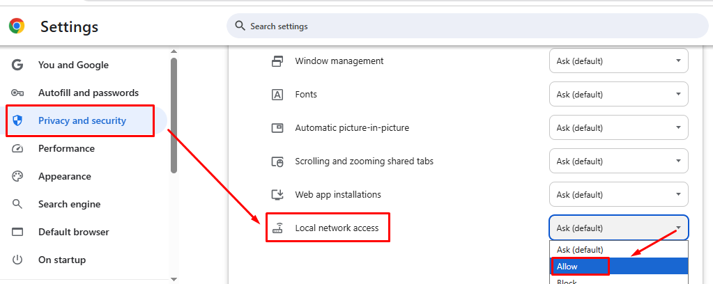Bước 2: Kéo xuống dưới tìm mục Local network access chọn Allow