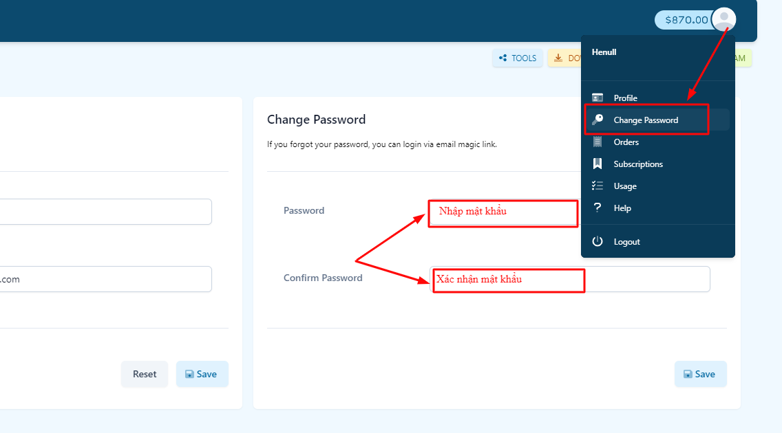 Sau khi đăng nhập, click vào icon ở góc trên cùng bên phải có một tùy chọn thả xuống, chọn [Change Password](https://www.henull.com/account).&#x20;