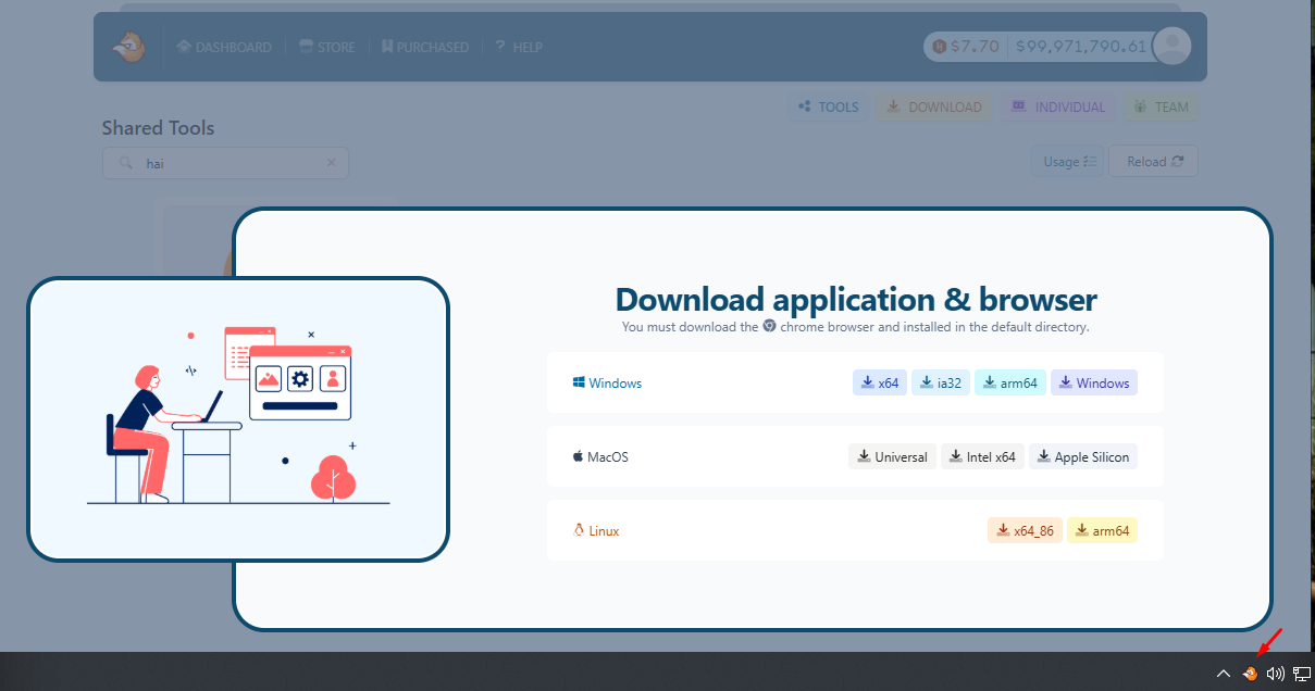 Sau khi ứng dụng Henull được cài đặt, hãy chạy Henull App rồi truy cập vào tài khoản Henull của bạn, đi đến <mark style="color:orange;">PURCHASED</mark>, click vào tab <mark style="color:orange;">Shared Tools</mark> rồi click vào <mark style="color:orange;">Application</mark> phía dưới sản phẩm để sử dụng.&#x20;