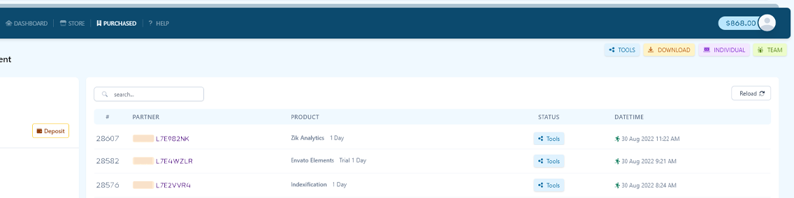 <figure><img src="https://2039307566-files.gitbook.io/~/files/v0/b/gitbook-x-prod.appspot.com/o/spaces%2Fs5A1sp77Z2YB11yb4t4V%2Fuploads%2F8i3JlXUl2LLPJxOYdkFH%2FScreenshot_121.png?alt=media&#x26;token=0c46e210-6876-4792-8b9a-8007b429520b" alt=""><figcaption><p><mark style="color:green;">Click Reload hoặc ấn f5 để cập nhật đơn hàng/tool của bạn nếu nó chưa xuất hiện</mark></p></figcaption></figure>
