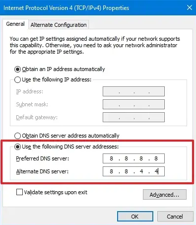 * Windows: Nhấn <mark style="color:orange;">Windows + R</mark> và gõ <mark style="color:orange;">ncpa.cpl</mark> để mở <mark style="color:orange;">Network Connections > Properties > Internet Protocol Version 4 > Use the following DNS server addresses</mark> và nhập địa chỉ của DNS server bạn muốn sử dụng. Bỏ qua nếu đã được nhập hoặc thay thế DNS server khác nếu bạn muốn.